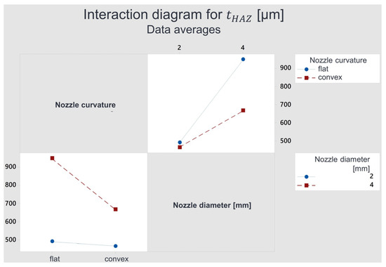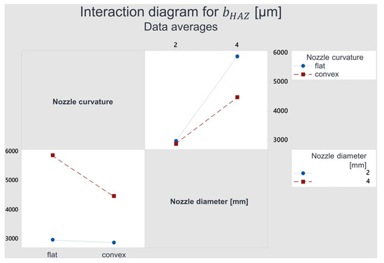 The highly significant interaction represents the interaction (AB). The interaction effect was −658.1 µm for the width and −127.8 µm for the depth. For better interpretation, a graphical interpretation was made—see Figure 9 and Figure 10. In both figures, in the bottom left, the fibre nozzle curvature (A) is plotted on the x-axis versus the dimensions of the HAZ on the y-axis. The red line represents the fibre nozzle with = 4 mm, and the blue line represents the fibre nozzle with = 2 mm. It can be seen from Figure 9 that the width and depth behave almost identically, except for the scaling. This indicates that the interaction effect was similar for width and depth. The blue line is nearly horizontal, whereas the red line has a noticeable downward slope. For the fibre nozzle with = 2 mm diameter, there is almost no difference between a planar fibre nozzle and a convex fibre nozzle. The nozzle curvature, therefore, has virtually no effect on the HAZ characteristics for the smaller fibre nozzle. However, for the fibre nozzle with = 4 mm, a convex fibre nozzle causes a smaller width of the HAZ than a planar fibre nozzle. The top right diagram shows the same situation. Here, however, the colours of the lines represent the nozzle curvature, and the nozzle diameter is plotted on the x-axis. The nozzle diameter, therefore, has a much more significant influence on a planar fibre nozzle than on a convex fibre nozzle.