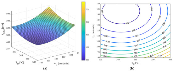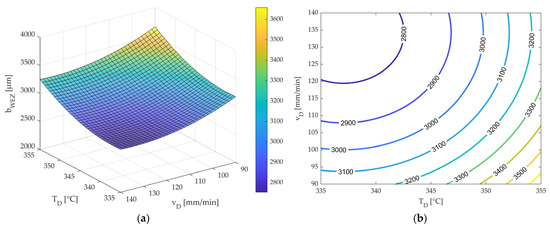 The standard error of the regression was 108.54 µm. The model can, therefore, predict the width values with an accuracy of 108.54 µm. The coefficient of determination was R2 = 0.8051 and was close to one. The model can, thus, explain a large part of the variance. The model is illustrated in Figure 11 as a surface response (a) and contour plot (b) for interpretation. Figure 11 shows that the HAZ’s width decreases with a decreasing nozzle temperature and increasing nozzle feed.