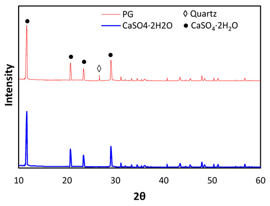 XRD was carried out to determine the structure of the PG. The results from XRD analysis revealed that all observed lines were attributed to calcium sulfate dihydrate (CaSO4·2H2O), with three main lines located at approximately 2θ = 12°, 20.5°, 23°, and 29°. The presence of a line attributed to quartz was also observed, located at 2θ = 26° (Figure 2) [31,32].
