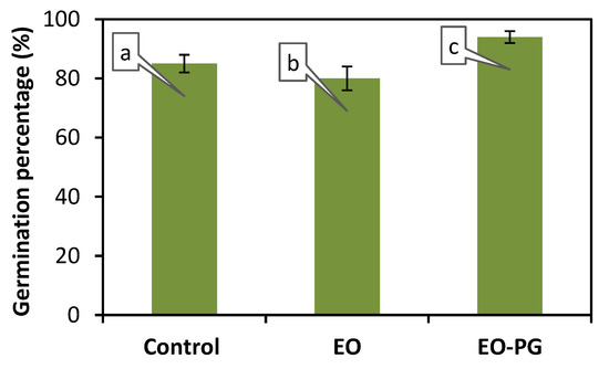 The higher percentage of germination observed in the EO–PG treatment suggests that the addition of phosphorus through the EO–PG formulation may have contributed to improved germination compared to the control and EOPH treatments. It is important to note that the concentration of the EOPH and EO–PG treatments can affect their efficacy. The results of this study suggest that the EO–PG treatment with a concentration of 0.01 µL·g−1·cm−3 was the most effective in promoting lentil seed germination. However, additional research is required to validate these findings and establish the ideal concentration of the EO–PG mixture for enhancing the germination process in lentil seeds [47].