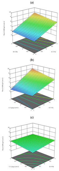 Based on the results obtained, the first-degree polynomial mathematical model is presented with the factors, second-order interactions, and third-order interactions of these three factors. Equation (14) shows the coefficients of the flux model of the EOPH fixed on the PG medium. The average flux obtained from the optimization route was found to be 7.14 × 10−4 g·h−1·cm−1. It can be concluded that all three factors—temperature (T), humidity (H), and concentration (C)—significantly increase the flux when studied individually on the support.