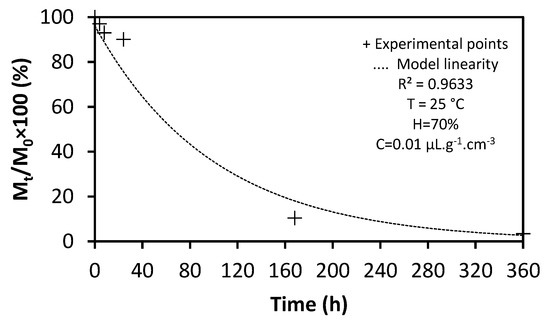The optimal conditions (T = 25 °C, H = 70%, C = 0.01 µL·g−1·cm−3) were employed to perform the kinetic study, which controlled the mass percentage of oil as a function of time through simulations of analytical treatments during desorption (Figure 7 and Figure 8). The research found a clear decrease in the mass percentage of essential oil, indicating the desorption mechanism. The diffusion coefficient (D) was estimated to be approximately 8.77·10−6 cm2·h−1 under optimal conditions. Furthermore, the experimental results from the simulation showed that 96.6% of the EOPH was desorbed over a span of 15 days (360 h).