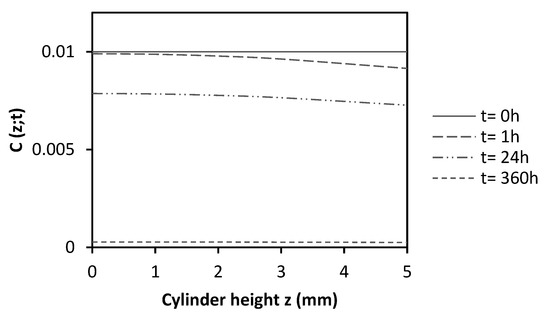 As the dominant diffusion in the cylinder occurs in the height direction, which is significantly smaller than the diameter and lateral surface, the transfer of diffusion can be simplified and considered as one-dimensional. This simplifies the problem, and the diffusion equation can be expressed using Fick’s second law: