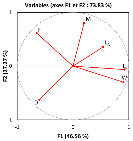 The mapping displayed in Figure 9 provided several interpretations. First, the diffusion coefficient D and the flux F were perpendicular in the correlation circle, indicating that these two variables were not correlated and were independent. Second, the diffusion coefficient D was inversely correlated with the mortality M% and the length of the aerial part LA, while the flux F was inversely correlated with the weight W and the length of the root part LR.