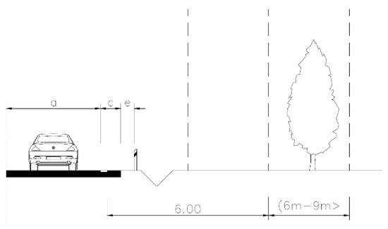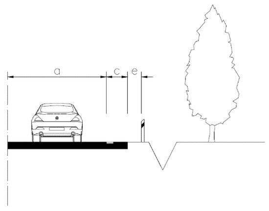 The first factor necessary to assess the risk of a fixed obstacle is the perpendicular distance of the obstacle from the edge of the lane. In the case of the absence of horizontal road markings, the distance is determined from the hard shoulder of the roadway. The criterion in question is monitored at the following three intervals in Figure 2, Figure 3 and Figure 4. The exposure presented in the Figure 2 represents a high risk, Figure 3 indicates a medium risk, and Figure 4 represents a low risk. The parameter “a” represents the traffic lane width, “c” represents the hard shoulder width, and “e” represents the shoulder width.