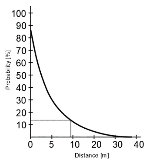 Graph of the probability and perpendicular distance of the vehicle going off the road at a speed of 90 km/h [19].