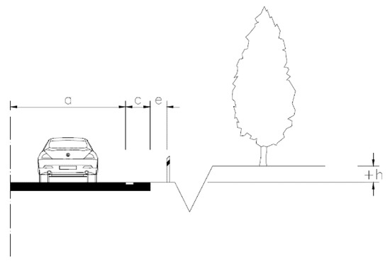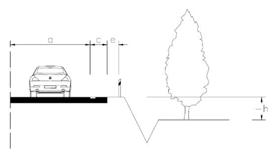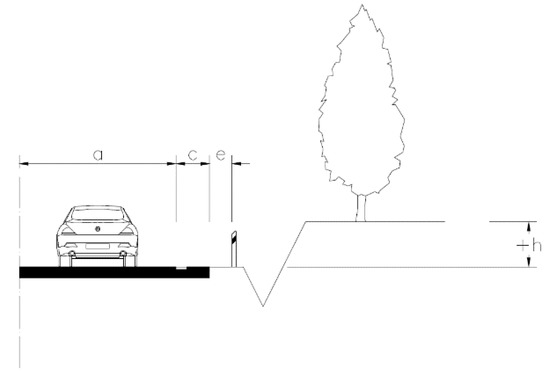 The upper limit of the height difference was determined on the basis of the main Czech standard related to road design [6]. The standard shows that if the adjacent slope is correctly graded, objects higher than 1.5 m above the road level may not be considered as fixed obstacles. Parameter “a” represents the traffic lane width, “c” represents the hard shoulder width, “e” represents the shoulder width, and parameter “h” represents the height difference between the traffic lane and the lowest part of the fixed obstacle.