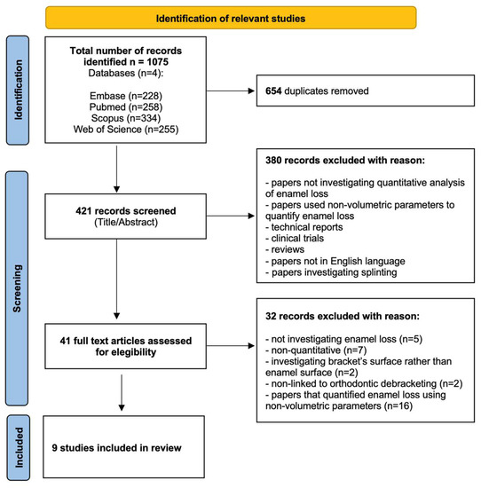 One thousand seventy-five records were identified through database searching. Following removal of duplicates, 421 records were screened by title and abstract. During the screening process, in agreement with all the reviewers, 380 records were excluded as not relevant to the subject, and 41 articles were selected for full-text analysis; 32 studies were excluded since they did not meet the eligibility criteria due to the following reasons: they did not investigate enamel loss (5 studies) or did not perform quantitative evaluation (7 studies), or they were studies considering the bracket surface rather than the enamel surface (2 studies), studies not linked to orthodontic debracketing (2 studies), or articles that quantified enamel loss using non-volumetric parameters (16 studies). Finally, nine studies [5,25,28,29,31,32,33,34,35] were selected for the systematic review. Risk-of-bias assessment for the included studies is shown in Table 2.