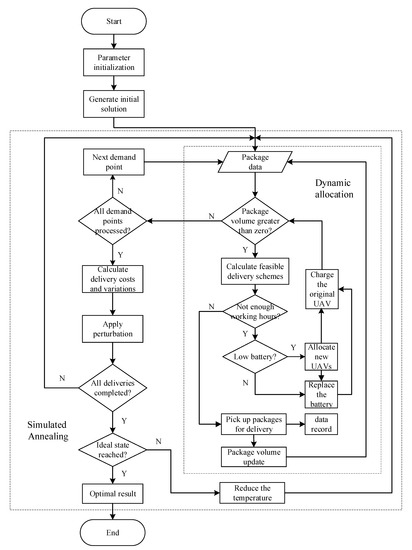 This paper uses an improved simulated annealing algorithm to solve the model. Specifically, dynamic allocation is added on the basis of the standard simulated annealing algorithm. For the dynamic allocation algorithm, Ref. [17] is referred to. Based on the literature, the process has been properly improved. The dynamic allocation algorithm can predict the best delivery scheme and drone demand dispatches. The simulated annealing algorithm is used to iteratively update the scheme to obtain the optimal one. The combination of the two can solve the problem of the variability of model parameters, so that the parameters can be dynamically adjusted during the calculations to find the best solution. The overall algorithm flow is shown in Figure 1.