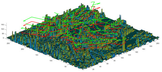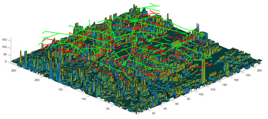 To verify the effectiveness of the model and algorithm in this paper, the actual data of express business volume, distribution points, and demand points in Shanghai are selected as sample data, as shown in Table 1. Select a real distribution point in the region to analyze the business volume for a certain day. The distribution point has 98 demand points and 5760 packages. According to the regulations on low-altitude use issued by the region, suitable delivery routes for drones have been planned in the preliminary work, that is, two urban air traffic networks constructed using road and building data. When planning the two-layer route, the A* algorithm and 500 × 500 grid network are used to avoid the airspace no-fly zone and ground obstacles. The flow chart is shown in Figure 2. The urban air traffic network (RN) constructed using road data is shown in Figure 3, and the urban air traffic network (BN) constructed using building data is shown in Figure 4. The routes on the two floors represent a 100 m high departure route and a 150 m high return route, respectively. The initial delivery time is set at 8:00 a.m. According to constraints (8) and (11), the peak time will start 3 h later and end 5 h later. In order to make the flight of drones during transportation as real as possible, this paper sets the simulation according to the performance parameters of drones currently used in logistics transportation on the market, as shown in Table 2 and Table 3. In this article, the idealized situation is considered, and it is stipulated that the drone equipment used in the experiment has been obtained without incurring any other costs due to the purchase of equipment.