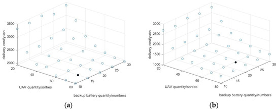 Keep the settings of the other parameters as shown in Table 2 and Table 3 unchanged. The number of drones is set to be 20, 30, 40, 50, 60, 70, and 80, respectively. The number of backup batteries is 10, 15, 20, 25, and 30, respectively. Multiple controlled experiments were conducted under the same conditions as other parameter settings and the airspace environment. The delivery costs required for the two different routes in each case were obtained, and the results are shown in Figure 6. The left side represents the RN route, the right side represents the BN route, and the unfilled hollow circle indicates the delivery cost under this condition, while the filled circle indicates that the lowest delivery cost has been reached at this time.
