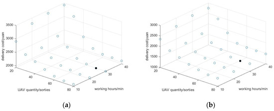 Keep the other parameters as shown in Table 2 and Table 3 unchanged. The number of drones is set to be 20, 30, 40, 50, 60, 70, and 80, respectively. The working hours are 10 min, 20 min, 30 min, and 40 min. Multiple controlled experiments were carried out under the same conditions as other parameter settings and the airspace environment. The delivery costs of the two different routes in each case were obtained, and the results are shown in Figure 7. The left side represents the RN route, the right side represents the BN route, and the unfilled hollow circle indicates the delivery cost under this condition, while the filled circle indicates that the lowest delivery cost has been reached at this time.