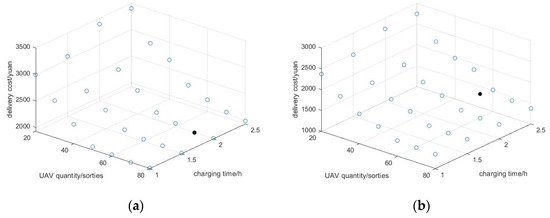 Keep the other parameters as shown in Table 2 and Table 3 unchanged. The number of drones is set to be 20, 30, 40, 50, 60, 70, and 80, respectively. The charging times are 1 h, 1.5 h, 2 h, and 2.5 h, respectively. Several controlled experiments were carried out under the same conditions as other parameter settings and the airspace environment. The delivery costs required under two different route situations were obtained, and the results are shown in Figure 8. The left side represents the RN route, the right side represents the BN route, and the unfilled hollow circle indicates the delivery cost under this condition, while the filled circle indicates that the lowest delivery cost has been reached at this time.