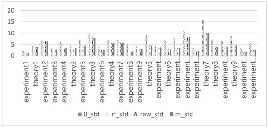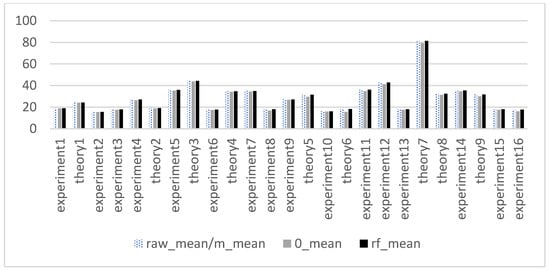 Table 3 presents the detailed performance of students in the C++ Programming course. The passing rates for the midterm and final exams were 64.75% and 44.26%, respectively. In the hybrid online and offline learning of this course, the low pass rate in the final exam could significantly reduce students’ enthusiasm for learning, indicating the need for corresponding teaching interventions. The overall mean and standard deviation (std) of the original data and missing values, filled by 0 fillings, mean filling, and a random forest algorithm filling, are shown in Figure 2 and Figure 3, respectively. The mean value was lowest when using the 0-filling method, and the standard deviation value was lowest when using the mean-filling method.