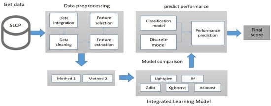 This study collected students’ learning data from the first six weeks and aimed to predict their process and outcome scores from the seventh week to the final exam. Currently, ensemble models are widely used in machine learning and have shown good performance. Ensemble models combine individual machine learning models in different ways to construct a model that has better performance and generalization ability than a single machine learning model [13]. Representative models in this category include Adboost, Gdbt, Randomforest, Xgboost, and Lightgbm. Different ensemble learning algorithms may perform differently on the same dataset. Therefore, this study compared the performance of different ensemble models to select the best-performing one for predicting student scores. The model prediction process is shown in Figure 4.