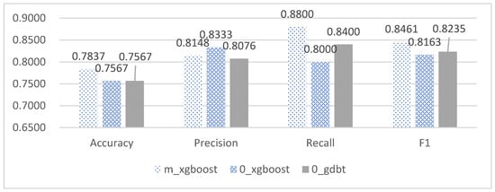Table 6 and Figure 7 depict the performance evaluation of three different imputation methods when predicting scores during the forecast period, wherein the Xgboost model achieved an accuracy of 78.37% under the mean imputation method, which was 2–5% higher than other models. Furthermore, the recall and F1 score of the Xgboost model was superior to all other models, while its precision was lower than the best model by 2%. Combining the information presented in the tables and figures, the Xgboost model under the mean imputation method demonstrated the most favorable performance in predicting scores during the forecast period.