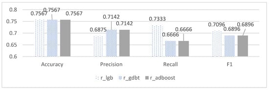 As demonstrated in Table 7 and Figure 8, under the random forest imputation method, the Gdbt, Adboost, and Lightgbm models attained the same accuracy evaluation indicator of 75.67%, which was 2–10% higher than other models in terms of accuracy. However, the Lightgbm model outperformed other models in terms of their recall and F1 score, while its precision was approximately 2% lower than the optimal model. Based on the comprehensive information presented in the tables and figures, the Lightgbm model under the random forest imputation method exhibited the most favorable performance in predicting end-of-period scores.