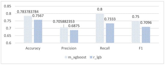 As shown in Table 8 and Figure 9, the Xgboost model under the mean imputation method in Method 2 outperformed other models by 2–10% in terms of accuracy and was approximately 3% higher in accuracy than the best-performing Lightgbm model in Method 1. Moreover, it demonstrated superior performance in other evaluation indicators compared to the Lightgbm model in Method 1. Based on the information presented in the tables and figures, selecting the predictive model in Method 2 generally yields better results than the predictive model in Method 1.
