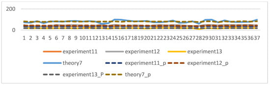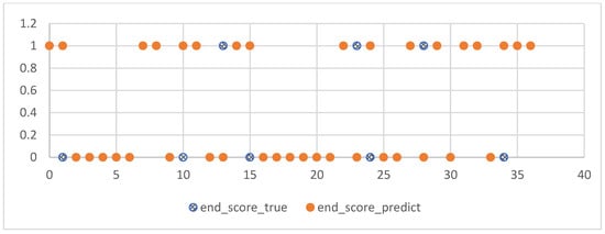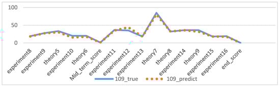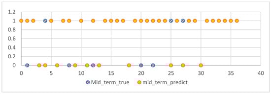 The experiments of this study were conducted from November 2022 to January 2023, with the aim of predicting the process grades and learning status of students from their 7th week to the final exam. After model prediction, good results were obtained, as shown in Figure 10: the blue line represents the true grades, and the orange line represents the predicted grades. For 109 students, both the midterm and final exam grades were correctly predicted, and other experimental grades and homework grades were well-fitted with small errors. However, there was some deviation between the predicted and actual values when predicting the score for Experiment 12. Overall, the continuous prediction effect was satisfactory. Considering the prediction of all discrete values, as shown in Figure 11, the fit between the true and predicted grades for Theoretical 7 was relatively poor compared to other grades, possibly due to the large range of values for Theoretical 7. However, good simulations of the student’s true grades were obtained for other discrete value predictions. For the prediction of midterm and final exam grades, the accuracy rates of both models in Section 3.7.1 were 78.37%, as shown in Figure 12 and Figure 13, where the patterns represent the true values, and the solid colors represent the predicted values.