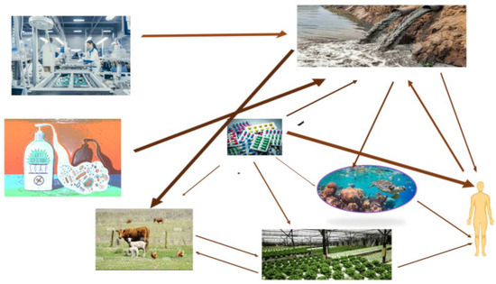 Antibiotics are considered “pseudopersistent” contaminants because they are continually being introduced into the ecosystem [8]. Antibiotics are introduced into the environment through a variety of sources. The most common are medical and veterinary use. In other words, antibiotics are widely used in the treatment of human and animal diseases, and the excretion of these drugs can end up in wastewater, which can then enter rivers, lakes, and other bodies of water [7,8]. Another source is in agriculture, where antibiotics are also utilized to prevent and treat bacterial infections in livestock and can end up in the environment through animal waste, which is often used as fertilizer [9]. On the other hand, antibiotics are used in aquaculture to prevent and treat bacterial infections in fish and other aquatic organisms and can therefore enter the environment through fish waste and wastewater from aquaculture facilities [10]. Furthermore, some industries, such as pharmaceutical manufacturing, produce wastewater that contains high levels of antibiotics, which can enter the ecosystem through discharge into waterways or through land application [11]. Nonetheless, antibacterial soaps and cleaning products can also introduce antibiotics into the ecosystem, as they can be washed down the drain and end up in waterways [12]. Figure 1 shows the release of antibiotics into the environment and their subsequent impact on the trophic chain.