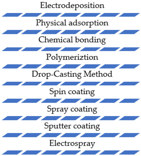 Despite the fact that nanomaterials can provide the above-mentioned advantages in the electrochemical sensing of antibiotics, their immobilization on the electrode surfaces and further functionalization with desired moieties is a quite challenging task. The success of these steps is basically a key factor in improving the electrode’s performance. Additionally, electrochemical signal interferences from other compounds with similar chemical structures can limit the selectivity of these sensors. The methods that are currently being employed for electrode modification with nanomaterials include electrodeposition, physical adsorption, polymerization, through chemical bonding, etc., as seen in Figure 2.