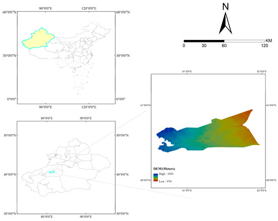 The Alar Reclamation Area is located at the southern foot of the Tianshan Mountains and the northern part of the Tarim Basin. The geographical coordinates are between 79°22′ and 81°53′ E and 40°20′ and 41°47′ N. It has a warm temperate extreme continental arid desert climate [14], with a total area of 6923 square kilometers (Figure 1). Alar is an alluvial fine soil plain by the Tarim River, and the terrain slopes from northwest to southeast. Water resources in the Reclamation area are provided by the Aksu and Tarim rivers with three major plain reservoirs, with an average annual sunshine of 2556.3 to 2991.8 h and a sunshine rate of 58 to 69%. Rainfall in the Reclamation area is scarce, with little snow in winter and strong surface evaporation. The average annual precipitation is 40.1 to 82.5 mm, and the average annual evaporation is 1876.6 to 2558.9 mm. The desert vegetation types are mainly trees, shrubs, herbs and short-lived plants; the vegetation cover along the rivers and basins is high, with more oases, forests and high-vegetation-cover grasslands distributed; at the same time, food-based crops and cash crops such as cotton, oil seeds and red dates are planted.