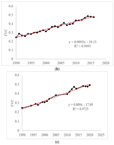 (a) Trends of spring vegetation coverage in Alar from 1990 to 2020. (b) Trends of summer vegetation coverage in Alar from 1990 to 2020. (c) Trends of autumn vegetation coverage in Alar from 1990 to 2020.