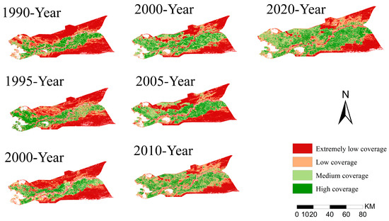 Spatial distribution of different levels of vegetation coverage in different stages.