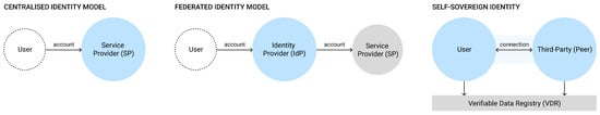 Self-sovereign identity (SSI) is a decentralised, user-centric approach to digital identity management that enables the actions of identification, authentication, and authorisation [3], without the need for external intermediaries [4] responsible for identity provisioning and management in the current centralised and federated approaches, where the power of control resides at the service or identity providers, as presented in Figure 1, where the blue colour represents an entity with control in a particular interaction. On the other hand, within the SSI, this control is shifted to each involved entity, while interactions can be based purely on peer-to-peer connections between the involved entities, who are the only ones accountable for generating, storing, and managing identifiers and correlated cryptographic keys, as well as acquiring, storing, and sharing their credentials that contain identity attributes that other entities attest to. The main advantage of the approach is that it enables entities (individuals/users and organisations) to self-create, control, and manage their identifiers and associated attributes, i.e., identity data [5]. At the same time, it allows controlling the flow of these data during digital interactions, increasing security and privacy by using cryptographic mechanisms.