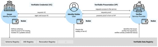 Within the SSI approach, users do not need to create an account with each service provider (SP), nor is there a need for an identity provider (IdP) to provide the user with an identity and its management, as identity data are stored in the user’s domain in digital wallets that are under the user’s full control. Similarly to other identity models, we can differentiate between three actors, namely, the credential issuer, the identity holder, and the credential verifier, as depicted in Figure 2. Each entity can act in a different role, depending on the context. The issuer attests to particular attributes of the holder by issuing and signing a verifiable credential (VC) digitally, containing one or multiple attributes or claims related to the holder responsible for retrieving, storing, managing, and presenting the acquired identity data with the verifier, who usually requires proof of identity to identify, verify, and ultimately allow access to the desired services. Therefore, the holder is at the centre of digital interactions, deciding when, with who, and what data he/she is willing to share. Thereby the verification process does not require the involvement of the issuer, as trust can be established by the utilisation of decentralised identifiers (DIDs) and DID documents holding the public keys of the holder, cryptographically signed verifiable credentials (VCs) and verifiable presentations (VPs), verifiable data registry (VDR), and identity wallets, which are essential components of SSI architectures.