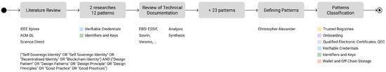 To verify that no further progress has been made in this area in the years since the SMS was conducted in 2021, and that no additional research has been carried out, we searched the digital databases IEEE Xplore, Science Direct, and ACM DL, using the search string (“Self-Sovereign Identity” OR “Self Sovereign Identity” OR “Decentralised Identity” OR “Blockchain Identity”) AND (“Design Pattern” OR “Design Patterns” OR “Design Principle” OR “Design Principles” OR “Good Practice” OR “Good Practices”). Thus, in the initial phase, we conducted a literature review which resulted in the identification of two sources, from which we obtained a set of twelve SSI design patterns [2,14]. Based on preliminary research and existing knowledge, we identified shortcomings in the defined patterns and recognised the possibility of expanding or supplementing the set of patterns. Consequently, a review and analysis of the technical documentation followed. We focused on the extensive European Self-Sovereign Identity Framework (ESSIF) documentation by the European Blockchain Services Infrastructure (EBSI) [26], Decentralised Identity Foundation (DIF) [27] and the World Wide Web Consortium (W3C) [7,8,16] documentation and standards, and, later, the Veramo [28] and Sovrin documentation [29]. The review and analysis were carried out in March and April 2022, and resulted in the identification of an additional twenty-three patterns. We synthesised the findings carefully and defined all the patterns based on the Alexander template [17]. For each identified pattern, we defined (i) name, (ii) summary, (iii) context, (iv) problem, (v) forces, (vi) solution, (vii) example of application, (viii) resulting context, (ix) related patterns, and (x) known use cases. Additionally, each pattern was also classified into a representative category. The process described is visualised in Figure 3.