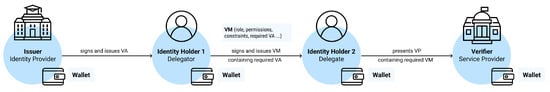 As mentioned in the previous section, the result of the research is a documentation of 35 design patterns defined using the Alexander template, whereby an example of (3.3) the Verifiable Mandate pattern is given below. The pattern addresses indirect identity control. Precisely, it provides a solution for delegation use cases where there are not just one, but multiple identity holders that delegate tasks/permissions from one to another, as presented in Figure 5. The remaining patterns have been defined in the same way, and are available at [30].