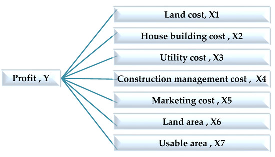 This model uses the results of the multiple regression analysis from the previous stage that was applied to the model and implemented. Moreover, the model used by the case study is used to clarify the model, and the main purpose is to assess the profitability of the housing development project located in Bangkok and perimeter in Thailand. In addition, the result of this model is the maximized profit of the project from the determination of the house type under the appropriate budget in each aspect of the project. In this case, the model consists of three main parts: (1) decision variables, (2) constraints functions, and (3) objectives functions. Therefore, all three main parts are explained, with the details being offered in Section 3.1–3.4, and the model results are presented in Section 4.