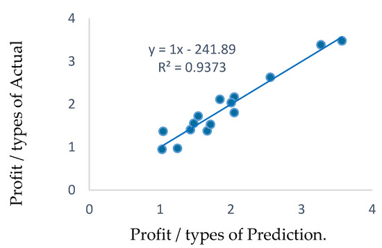 Figure 4 shows the comparison between actual data and the result of the predicted equation from the multiple linear regression analysis. Moreover, it was found that the prediction equation can predict the result of profit/type quite accurately, with 93.73%, or the coefficient of determination (R2) = 0.9373.
