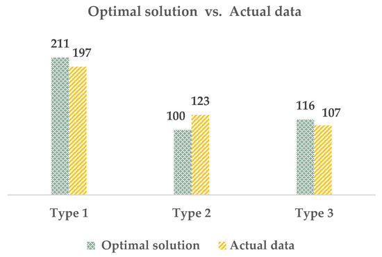 Figure 7 represents the number of houses for each type of actual data and the optimal solution or results of the optimization model. Then, as presented in Table 5, the profit/type data from the actual data (Table 4) were calculated with the number of houses for each type of the results from the optimization model, which is 211 for type one, 100 for type two, and 116 for type three. Therefore, the profit of the project was 967.36 MB, and that was very close to the project’s profit of the actual data (963.97 MB). When verifying the model, it was found that the percentage error accounted for 0.35%, as shown in Table 5.