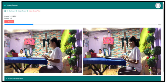 As seen in Figure 7 presented below, the prototype was able to recognize key points which include 13 body points. The system was able to calculate points distances and angles. Aside from these, the CSV files of all these feature points values can be downloaded. Once the video has been processed, it will show the recognition every 10 s in RED label (see Figure 8 below).