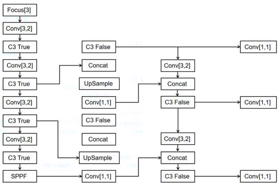 A structure of FPN + PAN [,] is used in the neck of the YOLOv5s network. Herein, the FPN layer conveys strong semantic features from the top to the bottom, and the PAN layer conveys strong positional features from the bottom to the top. Using this structure, the features extracted from different layers are aggregated in the detection layer, and the CSP2_X structure is introduced to enhance the network’s feature extraction capability.