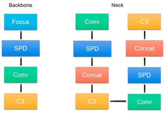 By incorporating this module in YOLOv5s, replacing the stride-2 convolutions in YOLOv5s with SPD-Conv, and replacing five stride-2 convolution layers in the backbone, the feature map is downsampled by a factor of 25. In addition, two stride-2 convolution layers are replaced in the neck, effectively improving the model’s capability to identify small objects and low-resolution images while reducing the loss of fine-grained information and the learning of less efficient features during feature extraction. The network architecture of YOLOv5s with the addition of the SPD-Conv convolution module is presented in Figure 4.