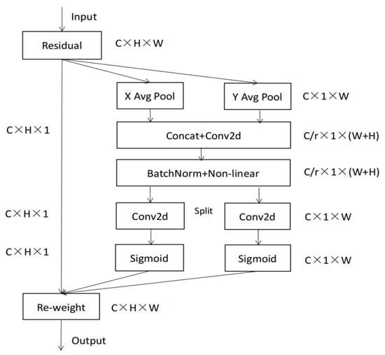 The attention mechanism has a significant effect on the improvement of the model performance. In addition, positional information plays a crucial role in the generation of attention maps. However, positional information is generally omitted in the construction of attention mechanisms. In SE attention, the focus is on developing interdependence between channels while omitting spatial features. CBAM introduces large-scale convolution kernels to extract spatial features. However, it omits long-range dependence issues. The coordinate attention (CA) [,] published in CVPR in 2021 differs from the previous single feature vector channel attention. The CA module aggregates features through two spatial directions, thereby generating a direction-aware and position-sensitive attention map. This process enhances the feature aggregation for the target of interest. The CA module architecture is presented in Figure 5.