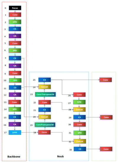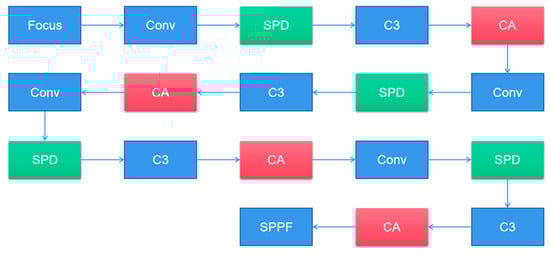 After adding CA to the C3 [] module in the backbone of YOLOv5s, cross-channel information, as well as direction-aware and position-sensitive information, is captured to help the model to accurately locate and identify objects in the training set. By emphasizing this information to enhance features, the network’s ability to extract feature information in the backbone is strengthened, enabling the network to focus more on the features of small targets and to reduce the influence of other information. This process, in turn, improves the model’s detection accuracy for small objects in blurred images. The backbone architecture after the CA module is added to the YOLOv5s model is presented in Figure 6.
