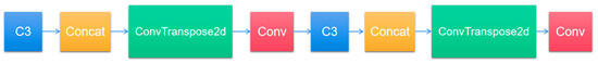 In the YOLOv5s architecture, we replace the nearest-neighbor interpolation in the original network with transposed convolution to expand the receptive field [] range in the neck structure. Doing so enables the network to capture more global information during the upsampling process, thereby reducing the loss of information and preventing problems such as low image resolution and detail loss at the end of the neck. The network architecture after the addition of the transposed convolution module to the YOLOv5s model is shown in Figure 8.