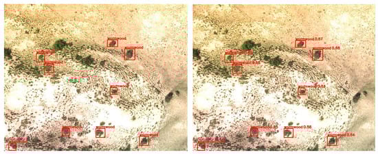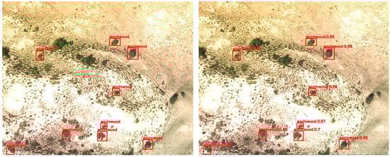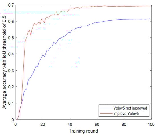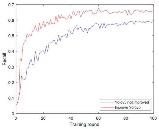The results shown in the graph indicate that the detection capabilities of the improved module are stronger than those of the original YOLOv5s for low resolution and small objects with an identical validation image. As observed in the graph, the detection confidence of the original YOLOv5s for small objects visible to the naked eye was 0.45. However, all the values of this parameter for the improved module were greater than 0.7. In addition, the improved model exhibited better detection performance for small objects at the edges of the image, whereas the original model had a higher rate of missed detection. To summarize, the improved model proposed in this study outperformed the original YOLOv5s model in terms of detection capabilities for low-resolution and small objects, along with a reduction in missed detections.