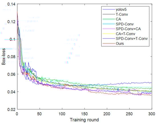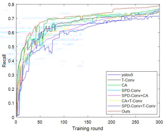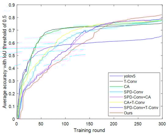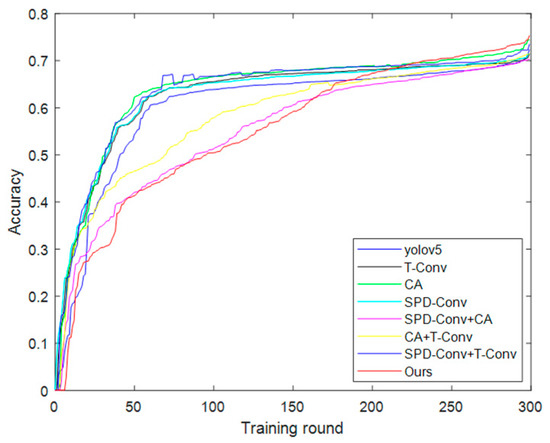 As shown in the table, adding the SPD-Conv, CA mechanism, and transpose convolution modules individually resulted in nonsignificant improvements in the model’s identification capabilities. The increase in mAP was large when only the SPD-Conv was used with the CA mechanism. However, the improvement in the model’s identification accuracy was nonsignificant. Using only SPD-Conv with transpose convolution resulted in decreased model recall rate and precision, although a certain improvement in mAP was achieved. The model’s recall rate and precision improved when the CA mechanism was used with transpose convolution. However, mAP decreased marginally. The model’s recall rate, precision, and mAP improved to varying degrees after the three types of improvements and the loss improvement were added. Compared with the original YOLOv5s, the number of network training layers increased by 47 layers, the number of model parameters increased by 2.89 M, the number of model floating-point operations increased by 24.2 G, and the inference time increased by 4.1 ms. Compared with the original network, the amount and reasoning time increased. Although the real-time performance of model detection decrease, the decrease has not been large. Moreover, the improved model significantly improved the accuracy of small-object detection in UAV fuzzy images. The improved model mAP, precision, and recall were increased by 14.96%, 6.24%, and 7.21%, respectively. Training results of different combinations of mAP, precision, recall and loss are shown in Figure 21, Figure 22, Figure 23 and Figure 24: