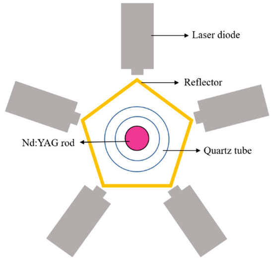 The structural diagram of the five-dimensional laser diode (LD) side-pumped module is depicted in Figure 1. In the module’s middle portion, the laser medium is enclosed by a transparent quartz flow tube. The deionized water serves as a cooling agent in the quartz flow tube, and the outer portion of the quartz flow tube is a highly reflecting material condenser [25,26]. Five LD arrays are outside the condenser to pump the 808 nm laser into the laser medium. The different structural components and geometric distances of the LD side-pumped module result in various distributions of the pumping power across the gain medium. Hence, the structural parameters of the commercial LD side-pumped module from Table 1 are considered during the simulation.