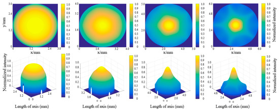 The intensity distribution after superposition is depicted in Figure 5. Compared to the distribution of the fundamental transverse mode ϕ1(r, z), the superposed intensity ϕ(r, z) shifts to a particular level. A Gaussian distribution still characterizes its central region, while its periphery has an explicit intensity distribution.