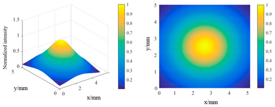 From Equations (3) and (4), the intensity distribution of the fundamental transverse mode is directly related to the beam waist size, which is determined by the parameters of the gain medium and the optical element positioned within the resonator. Thus, based on the primary parameters of the Q-switched Nd:YAG side-pump laser utilized in the experiment, the optical software can calculate the beam waist size of 2.09 mm. Figure 4 depicts the intensity distribution of the fundamental transverse mode ϕ1(r, z).