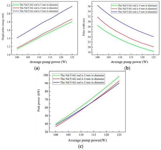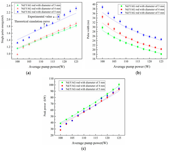 Comparison between experimental and theoretical results for output laser characteristics at different Nd:YAG rod diameters. (a) Single pulse energy versus average pump power; (b) pulse width versus average pump power; (c) peak power versus average pump power.