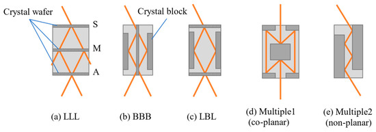 A crystal-based XI is an amplitude-division interferometer that uses the XRD of crystal wafers and/or blocks to divide, reflect, and recombine X-rays. Various crystal-based XIs with different optical configurations, such as the triple Laue (LLL) interferometer (Bonse-Hart type) using triple Laue-case XRD (Figure 2a) [2], the triple Bragg (BBB) interferometers using triple Bragg-case XRD (Figure 2b) [15,16], and crystal-based XIs combining the Laue- and Bragg-cases of XRD (Figure 2c) [17], have been devised, as shown in Figure 2. Furthermore, another type of crystal-based XI has been developed that uses simultaneous coplanar and non-planar X-ray diffractions for high-resolution imaging and suppresses beam blurring [18,19]. It diffracts X-rays simultaneously by satisfying multiple diffraction conditions on different lattice planes.