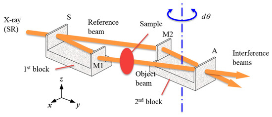 Among these interferometers, the LLL interferometer and its separated type [20] are currently used for practical PCXI. As shown in Figure 2a, the incident X-rays are divided into two beams (object and reference) split by the Laue-case XRD at the first wafer (S: splitter), and the two beams are reflected at the second wafer (M: mirror) and re-combined at the third wafer (A: analyzer), forming two interference beams. If a sample is placed in the object beam path, the interference beam intensities are changed by the wave superposition, so the phase shift caused by the sample can be detected on the basis of the intensity changes.