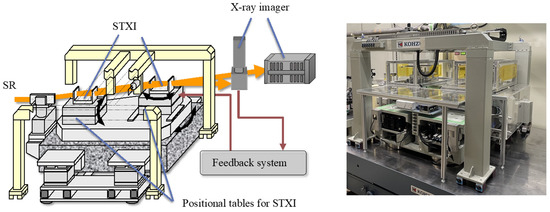 Figure 4 shows a schematic view and photograph of the implemented imaging system [32]. The system mainly consists of an STXI and its positioning tables, a sample holder and its positioning tables, a phase shifter and its positioning tables, an asymmetric crystal and its positioning table, an image feedback system, and an X-ray imager. Beamline BL-14C of the Photon Factory was dedicated to the imaging system. Vertical fan-shaped white SR emitted from the vertical wiggler of the beamline is first monochromatized by a double crystal monochromator using Si (220) diffraction (not shown in Figure 4) and introduced to the imaging system. The beam size of monochromatic SR is 70 mm in the vertical direction but only a few mm in the horizontal direction, so an asymmetric crystal is installed upstream of the STXI to expand the width of the beam by several times using asymmetric XRD. Although this enlargement reduces the SR intensity, uniform SR with a several-10-mm-width is generated for fine observation. One of the interference beams generated by the STXI is used for PCXI, while the other is used by the feedback system.